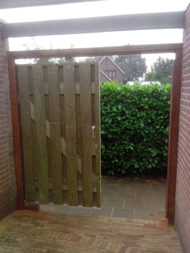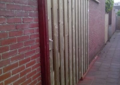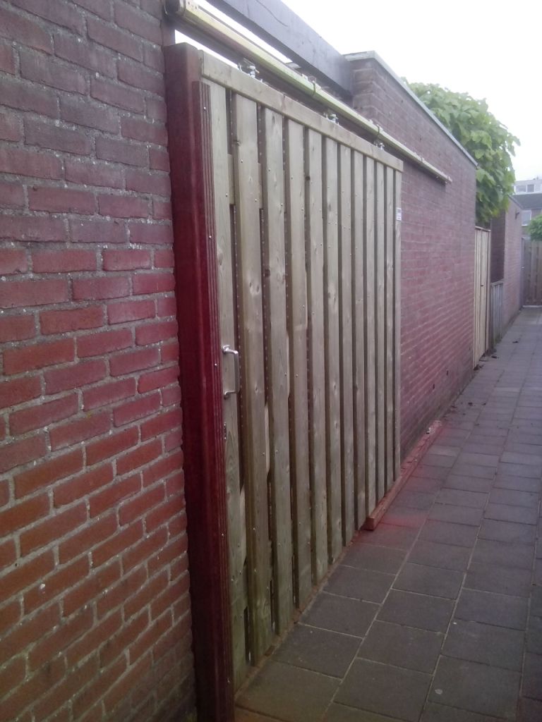 Dhr. van Giessen had de wens om in plaats van en normale poort, een schuif deur te laten maken zodat de achterdoorgang in zijn geheel geopend kan worden. Bv Koek heeft hier gehoor aan gegeven en dit gerealiseerd. Door middel van een zware rail met rollers is een degelijke constructie gemaakt die vlekkeloos open en dicht gaat.